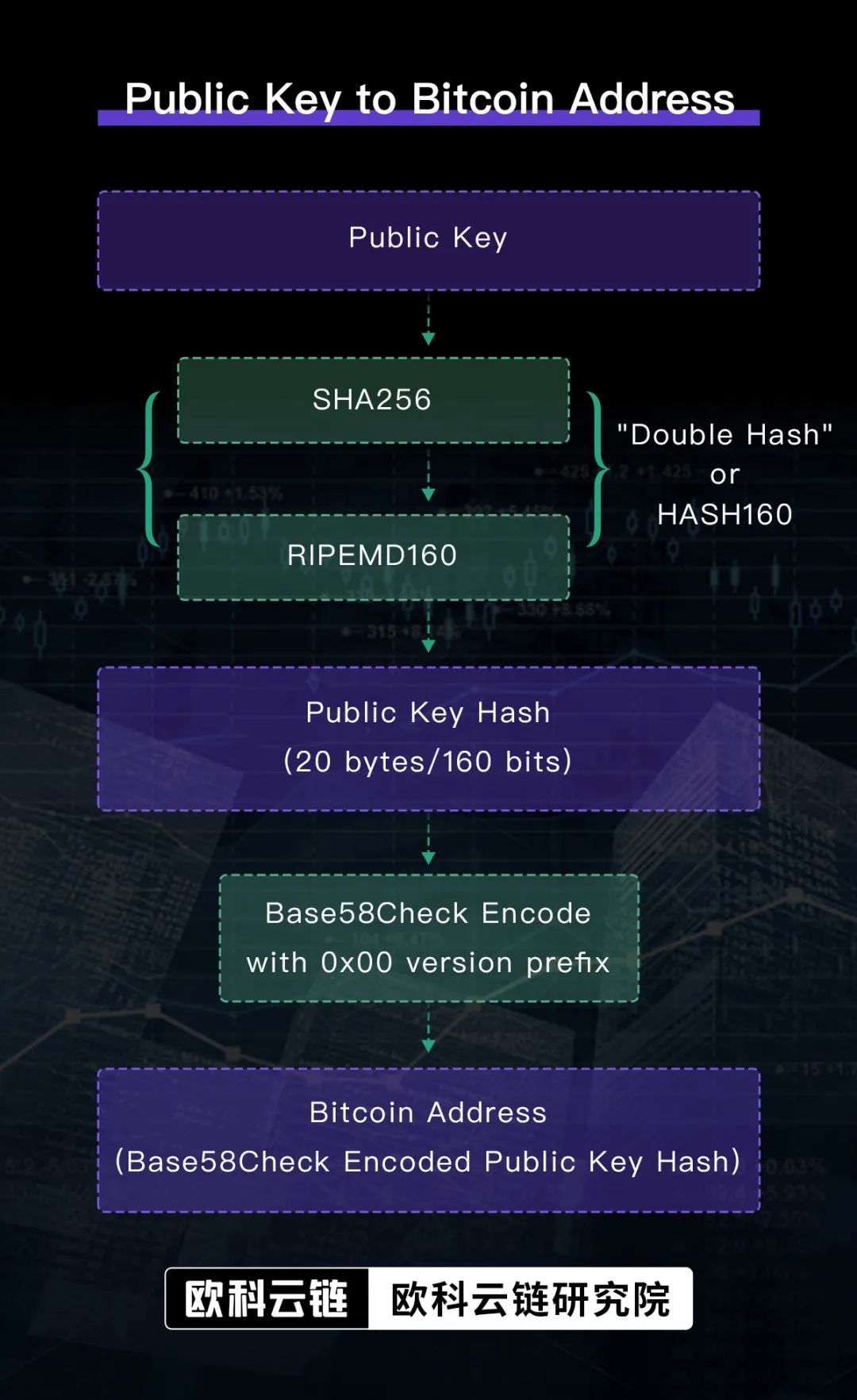 常见的区块链地址是通过加密算法从公钥或脚本中派生而来的一串由数字和字母组成的字符串。下图显示了比特币地址的生成过程(摘自《精通比特币》):