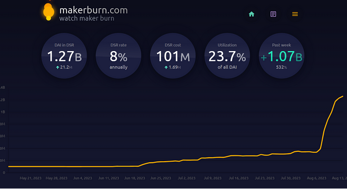 MakerDAO 今年多次上调 DSR(DAI 存款利率),先是从 1% 上调至 3.49%,最近直接上调至 8%,远高于美债收益率。在高存款利率的推动下,MakerDAO 的存款规模大幅增加。
