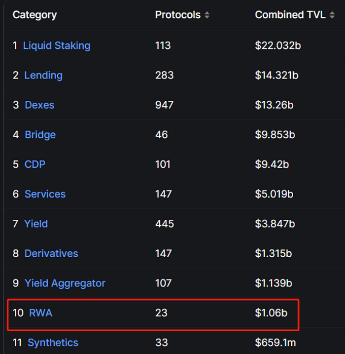 RWA是目前Web3和加密货币市场最热门的话题,被认为是推动新牛市的引擎。根据 DeFillama 数据,RWA 赛道有超过20个项目,总TVL 超过 10 亿美元,在 DeFi 市场TVL排名榜位列第 10。