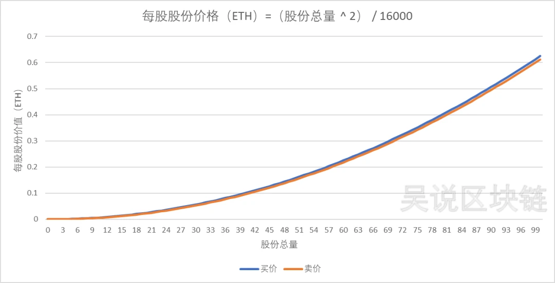 Price in ETH = supply^ 2 / 16000 ,即每股股份价格(ETH)=(股份总量^ 2)/ 16000