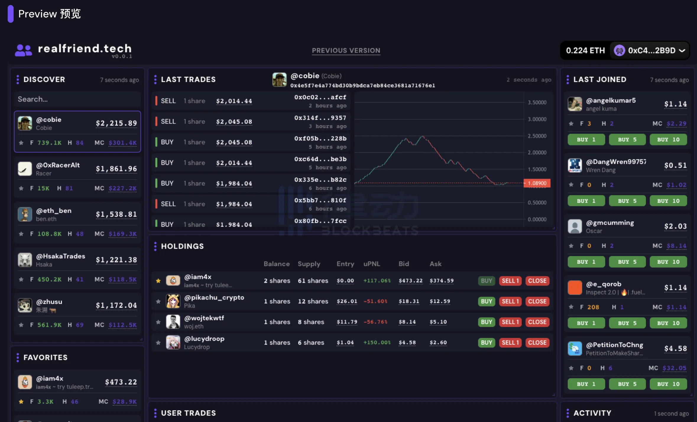 friend.tech 通过与 Twitter (现更名为 X)强绑定的方式,让用户可以通过 Base 链的以太坊购买任意 friend.tech 上用户的份额(Share),获取与其直接对话的权利,并且还有可以从中获利的可能性。friend.tech 变相的将用户的注意力赋予了成本,你要想获得更多的优质信息,意味着需要投入对等的资产。
