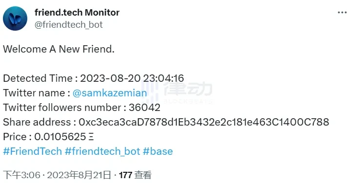 新入驻头部 KOL 可预期的 Share 价格增长,使得专门监控追踪新晋加入平台流量大 V 的 Bot(推特账号 @friendtech_bot)应运而生。