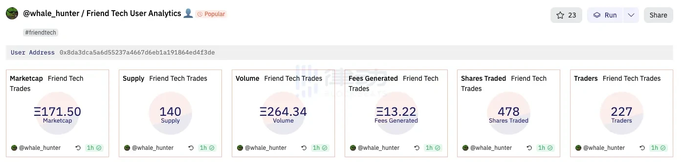 friend.tech 个人用户分析工具「Friend Tech User Analytics」,输入地址就可以查询该用户「账号份额」的总市值、当前供应量、交易量、交易费用、交易次数和参与交易用户数等数据。