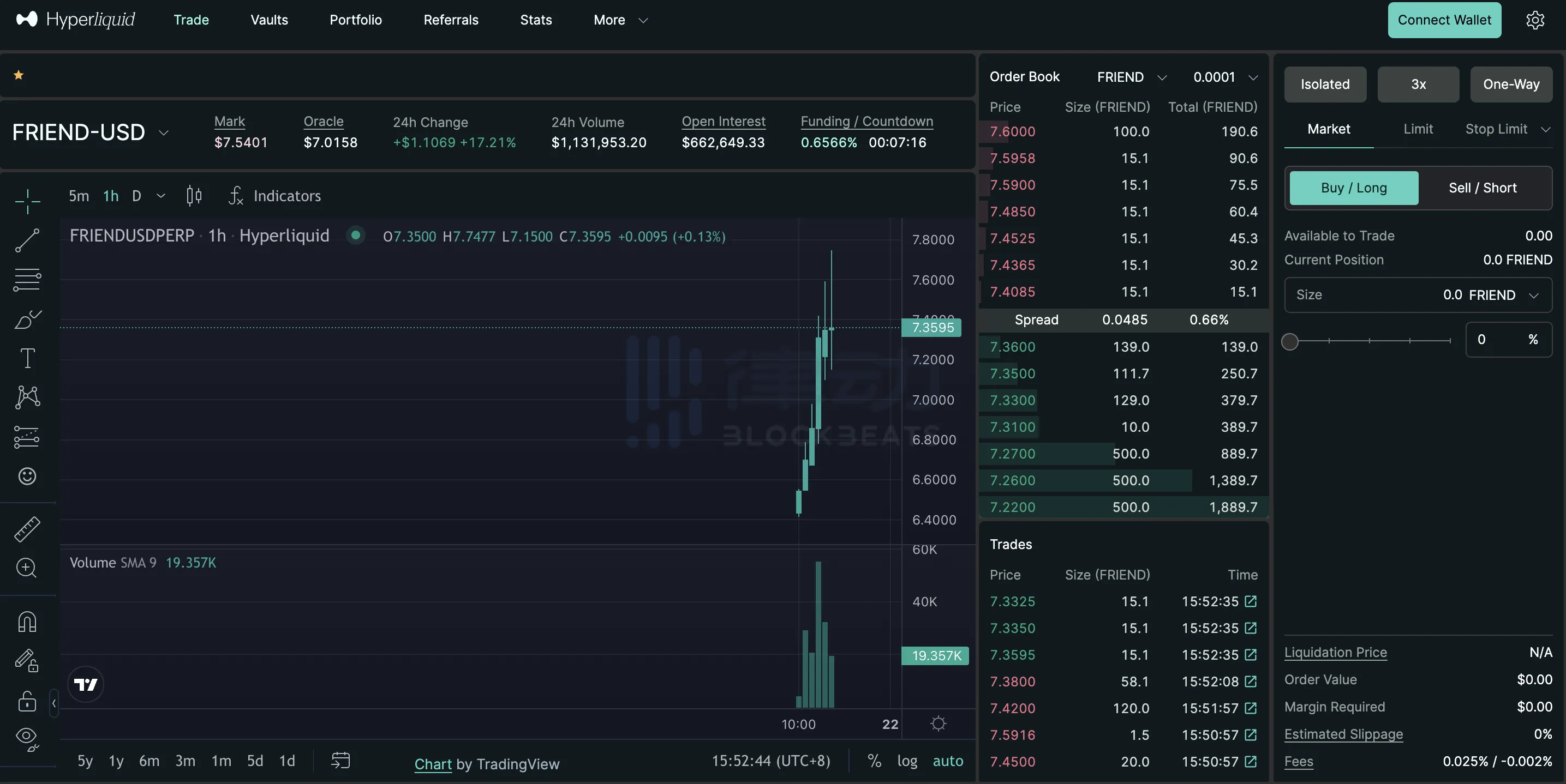 FRIEND-USD 是 Hyperliquid 上第一个指数永久合约,它跟踪所有未发行的 friend tech 份额的购买价格 ETH 总和,并将其转换为 USDC。FRID-USD 指数的精确计算公式是:Base 链上 friend 合约的 ETH 余额乘以 ETH/USDC 现货价格的中间值除以 100 万。