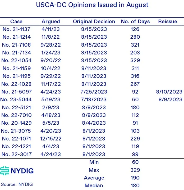 现实情况是,无法准确预测此类法律裁决的确切时间。仅从 8 月份发布的案件信息来看,从案件辩论到法院做出裁决的观察范围很广,影响法院裁决时间的因素也很多,其中许多是外人无法观察到的——意见的一致、其他紧急事务的时间安排、差旅等等,不一而足。
