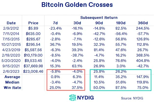 自上一次金叉出现(未出现死叉)过去了 6 个月,最近出现的交叉似乎继续证实了我们之前的观察:金叉在短期(7 天和 30 天周期)中似乎是负面指标,而在长期(90 天以上)似乎是积极指标。当然,我们还没有看到比特币距离最近一次交叉 360 天后的走势。