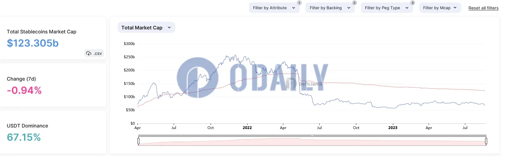 据 DefiLlama 数据显示,当前稳定币总市值约 1233 亿美元,创 2021 年 9 月 7 日以来最低水平, 7 日跌幅达 0.94% ,USDT 市值占比 67.15% 。