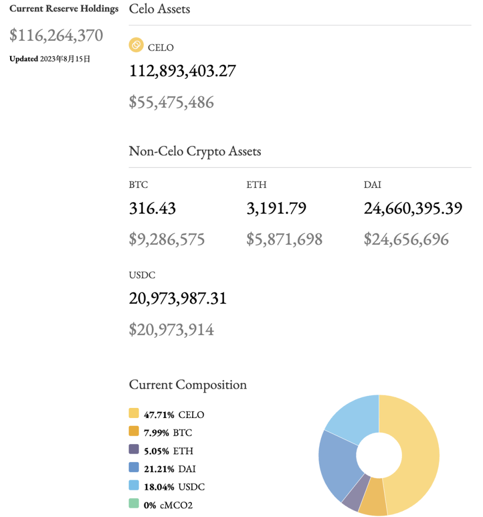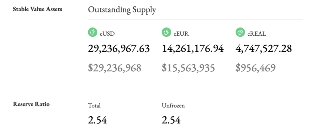 Celo 的稳定币背靠一套综合资产构成的储备池,储备池的储备率(储备资产价值除以流通稳定币价值的比率)远高于 1 ,这为其稳定币的内在价值提供了最核心的托底