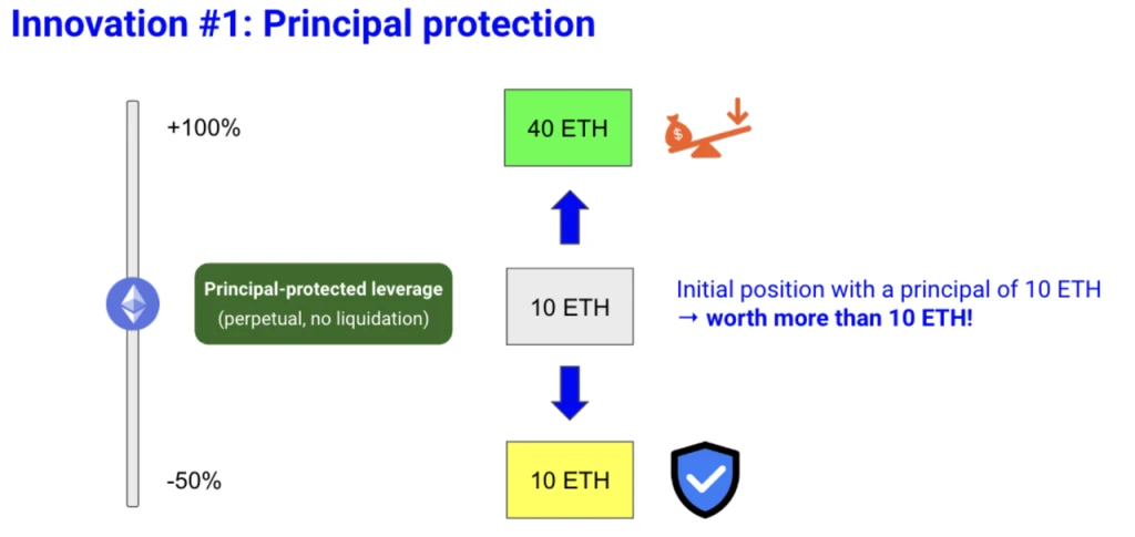 具体而言, Liquity 提出两点创新, 1 是所谓“本金保护的杠杆交易”, Liquity 会给合约交易者提供一种保护本金的杠杆交易产品,用户在支付一定权利金( premium )之后,就可以使用这个功能,这个功能可以使得即便 ETH 大幅度下跌的情况下,他们也可能收回一定的 U 。根据 Liquity 文章中的例子,当 ETH 价格 1000 U ,用户支付 1 2 ETH (其中本金 10 ETH 权利金 2 ETH ),可以获得 10 ETH 的 2 倍杠杆做多仓位+下跌保护,也就是说,当 ETH 价格翻倍, 2 倍杠杆做多仓位生效,上涨使得用户获得总计 40 ETH ;当 ETH 价格下行时,用户购买的看跌期权生效,用户随时可以取回本身的 10000 U (10* 1000)。