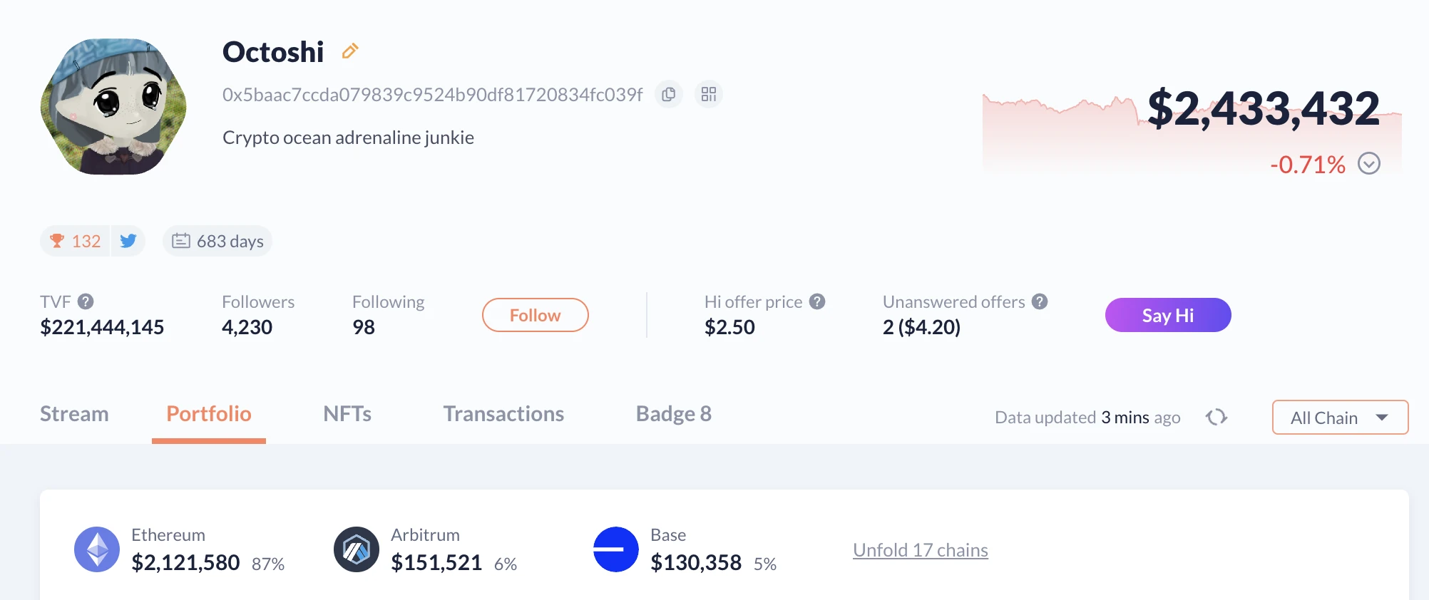 Octoshi.eth 的个人推特也仅仅只有一千余名粉丝。但其钱包地址却颇为富有,目前有超过 240 万枚的资产。