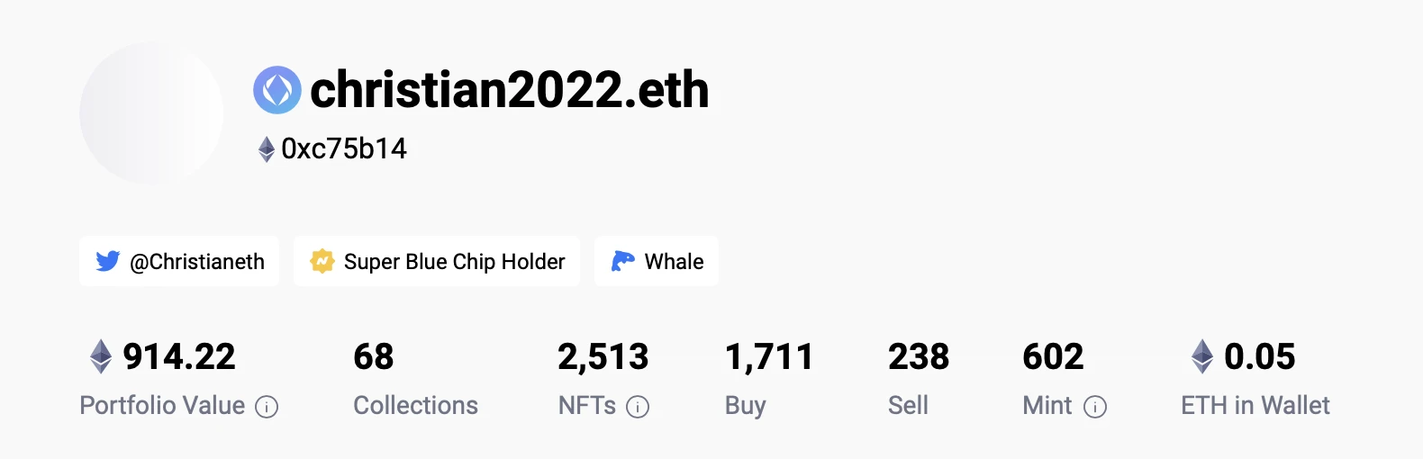 Christian 是近期热度很高的 00 后巨鲸,是加密基金 NDV (NextGenDigital Venture)联合创始人和 NFT 超级大户,此前因 Azuki 遭遇下跌一夜接盘数百枚系列 NFT 而受到关注。
