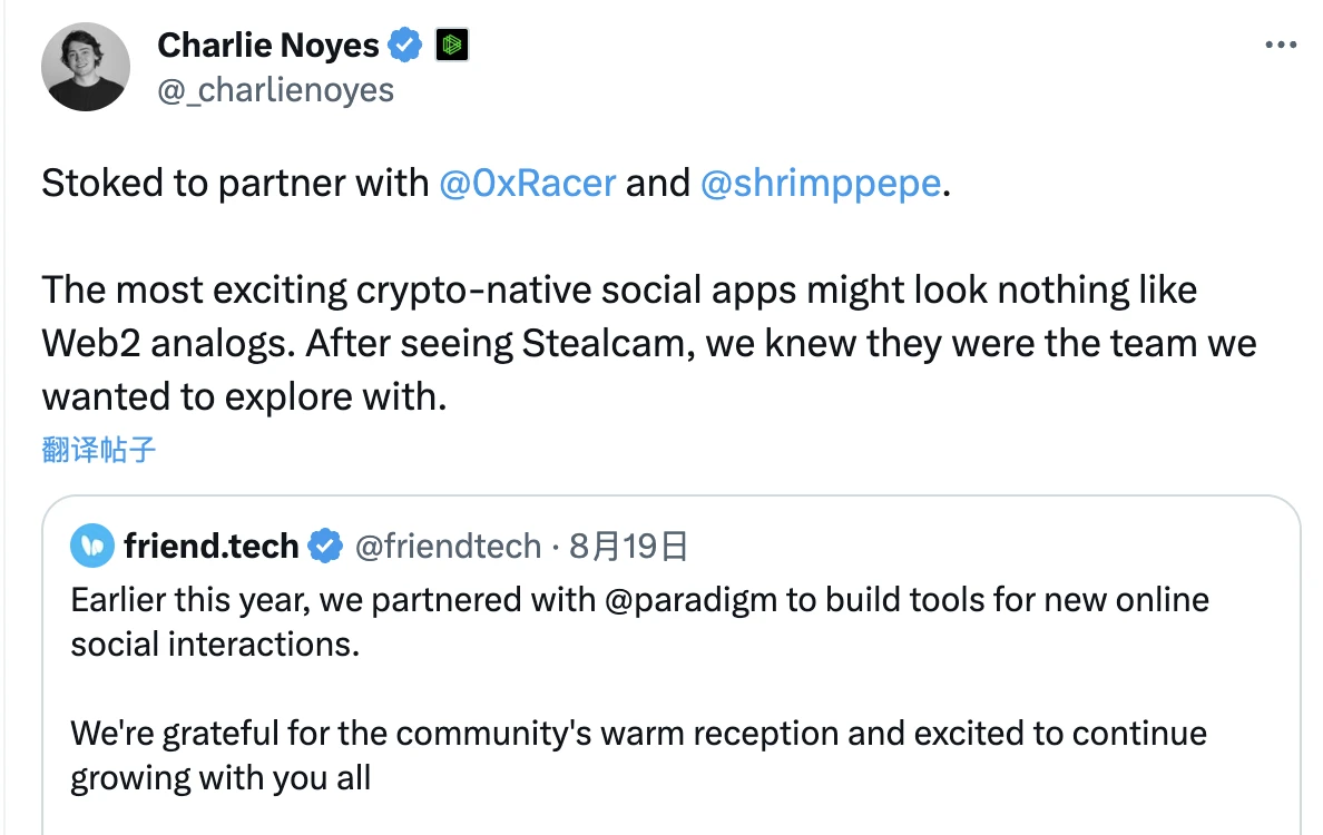在 Paradigm 宣布投资的一则推文里,Paradigm 公开了 friend.tech 的两位创始人,这也让二人的身价迅速飙升。