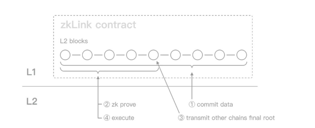 正常的 zk-Rollup 有三个阶段依次运行:提交阶段、证明阶段和执行阶段。zkLink 在证明阶段和执行阶段中添加了一个同步阶段。由于 zkLink 是多链统一,所以同步阶段的作用是将不同链的状态统一。