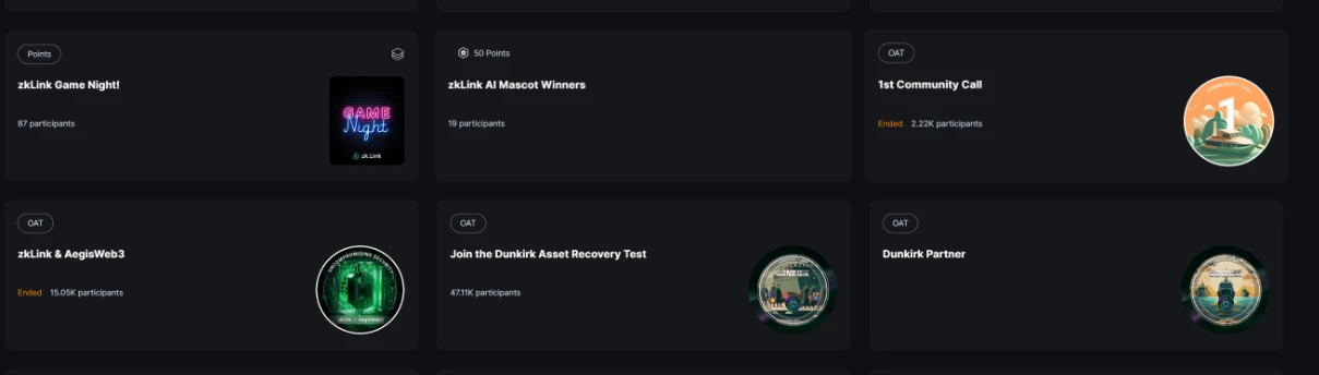 目前, zkLink 在 Galxe 推出新的忠诚分机制 ,预计今年第四季度开始。该忠诚分将作为空投的标准。根据下图,目前在 Galxe 显示的是之前活动的积分奖励。