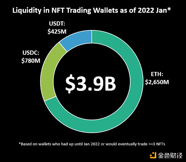 2022 年 1 月 1 日,满足我们 3 次以上 NFT 交易标准的钱包在其钱包中拥有超过 3.9B 美元的流动资产。这仅涉及 USDC/T 和 ETH。