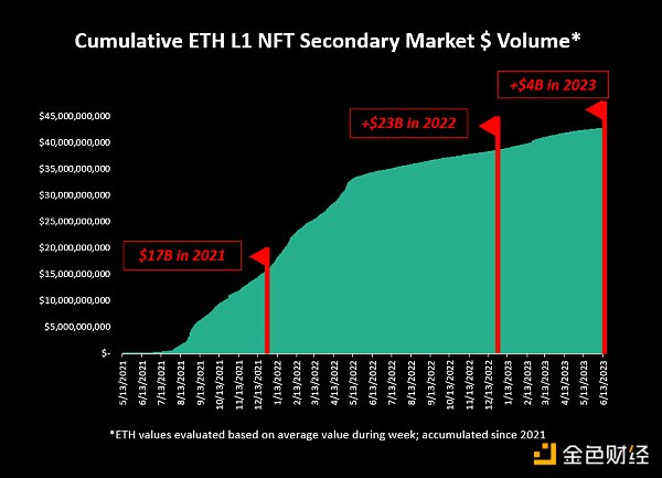 过去 2.5 年,ETH L1 上的 NFT 交易量的美元价值为 440亿美元。 那么,首先检查一下,如果仅在铸币和费用上花费了 80亿美元,那么交易量可能是其 6-7 倍是否有意义?