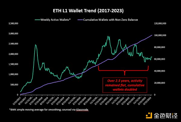 我们可以查看以太坊的月平均钱包总数,并将其与非零钱包的数量进行比较。 在 过去 2.5 年里,非零钱包的累计数量翻了一番,而每月使用该链的平均钱包数量却持平。