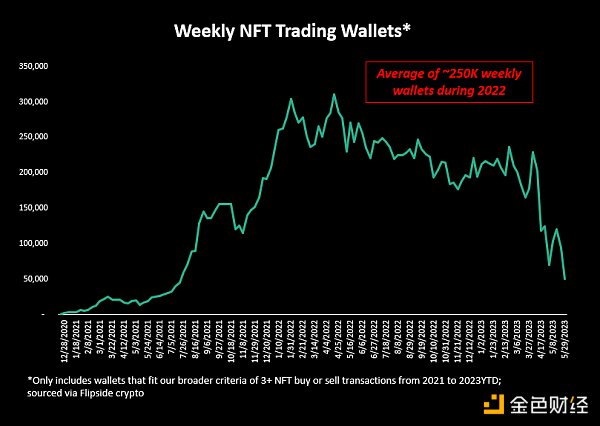 不幸的是,我们最好的“使用”指标是上周购买或出售了 NFT。 在 2022 年的大部分时间里,每周钱包数量约为 25 万个。