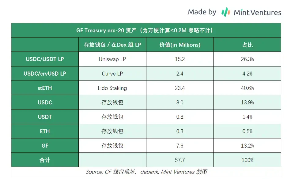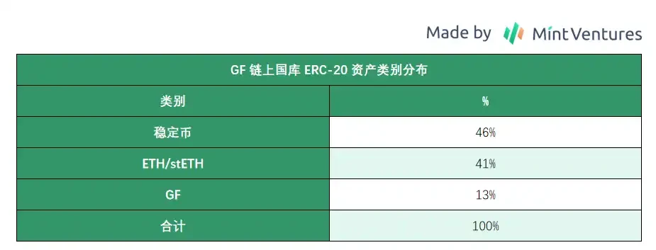 由于 GF 的资产有许多在 Uniswap 上做 LP,难以通过 Arkham 直接展示,下图为所公示钱包的 ERC-20 资产链上资产统计:可以看到,GF 的链上国库中有 46% 稳定币, 41% ETH/stETH, 13% GF,以及一些小额游戏相关代币的投资,共计 5770 万美元。