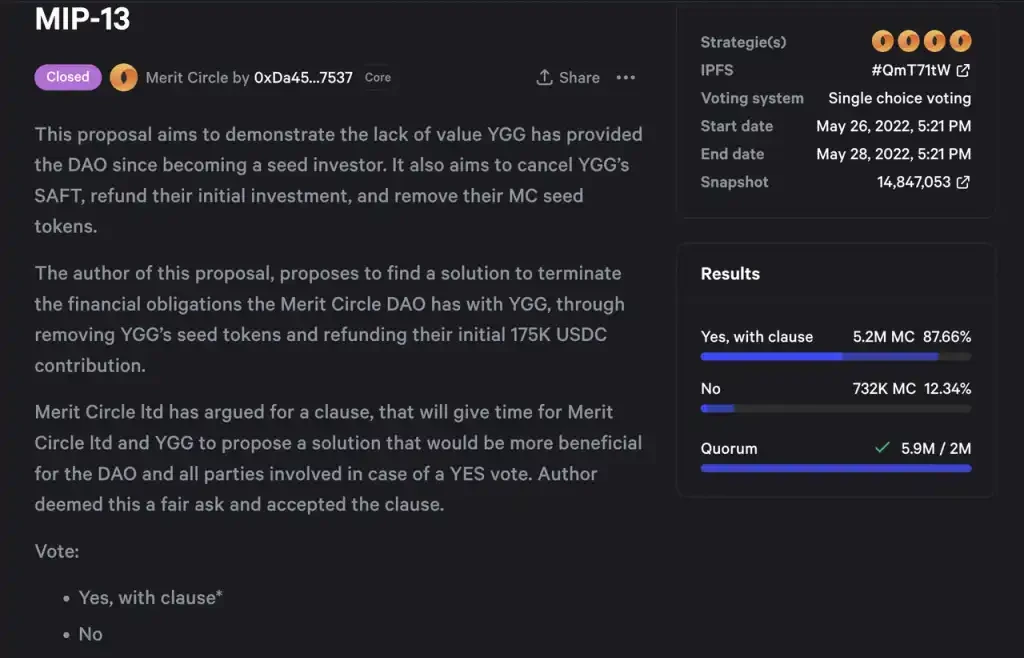 而 Merit Circle 则会让用户看到一个运营流程完备、具有风控意识的 Gaming DAO / Investment DAO 应该是如何运行的:过去两年,Merit Circle 的 Snapshot 共有 26 个提案投票,其中有 DAO 治理、投资风险管理(退出和投资额度的授权机制)、游戏开发等。比较重要的提案有: