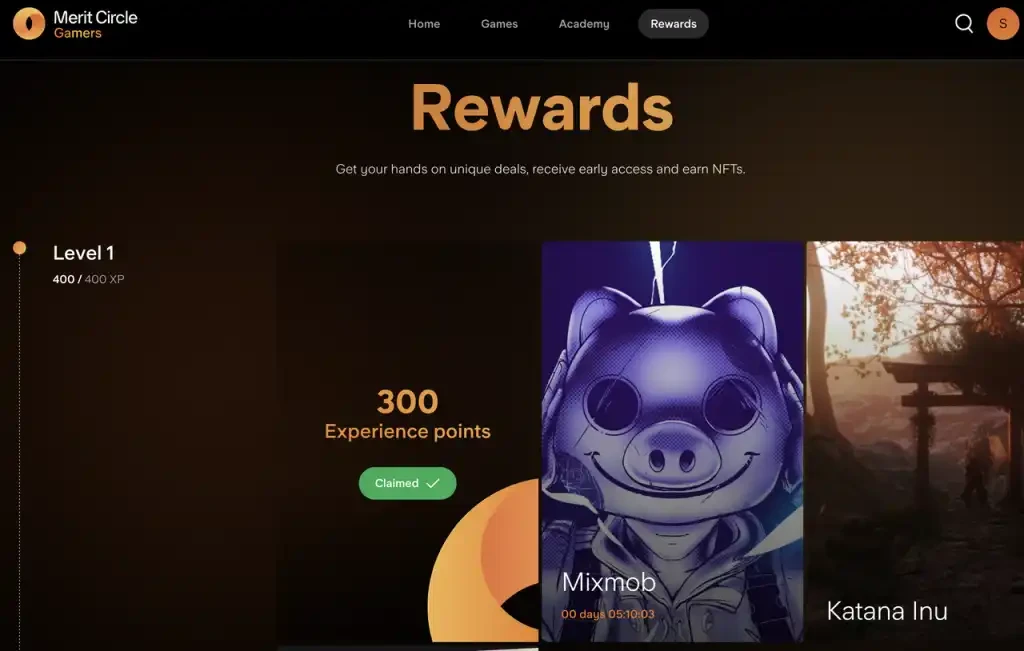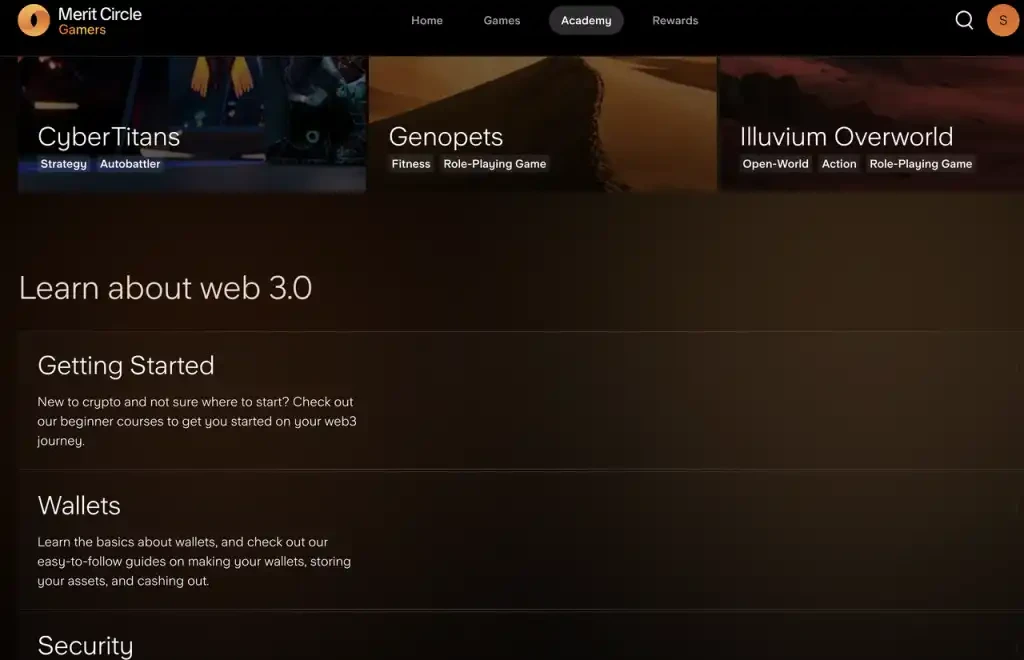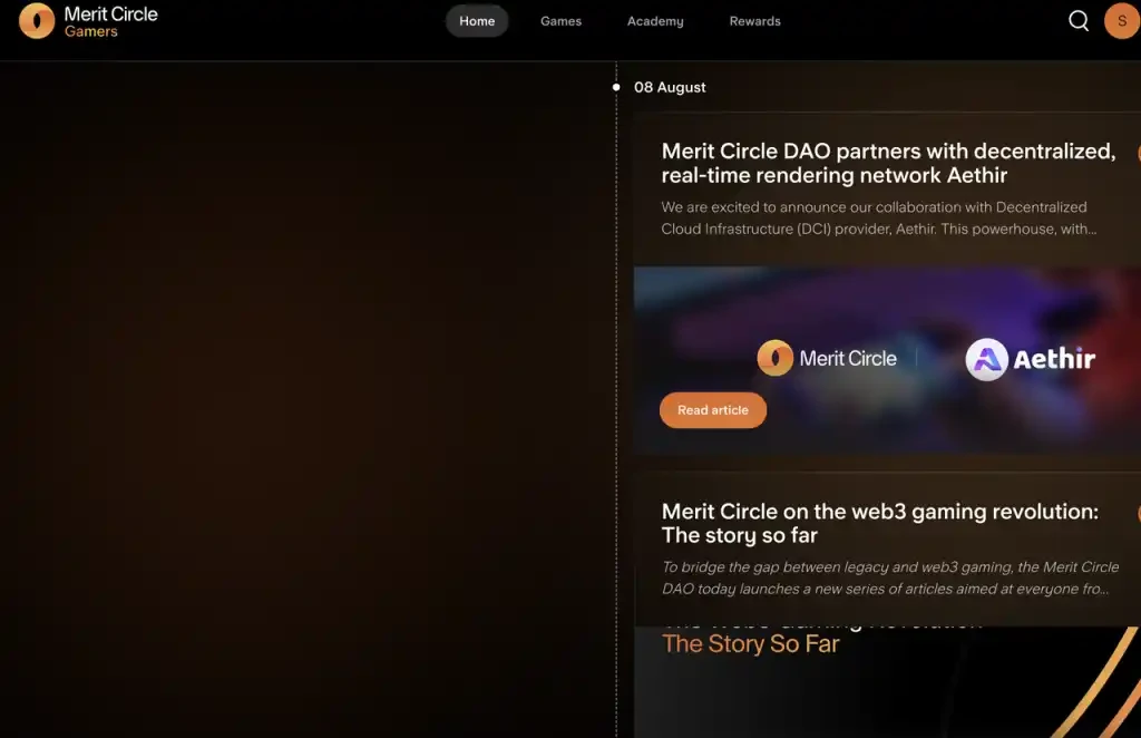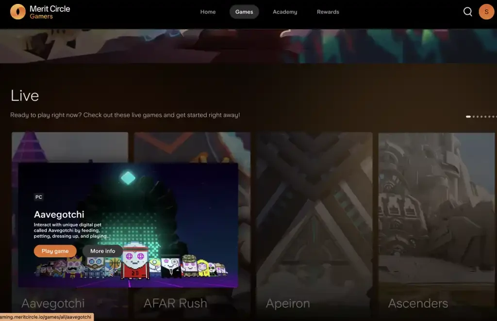 相比 YGG Quest System 的简单粗暴上任务,Merit Circle Gaming 的界面更加游戏友好。这个激励体系的官网分为四部分:主页(重点游戏介绍和活动时间线),游戏(重点游戏展示和相关信息总结),学院(游戏教程和 Web3 操作基础教学)和任务体系(完成任务,奖励经验和游戏 NFT 抽奖)