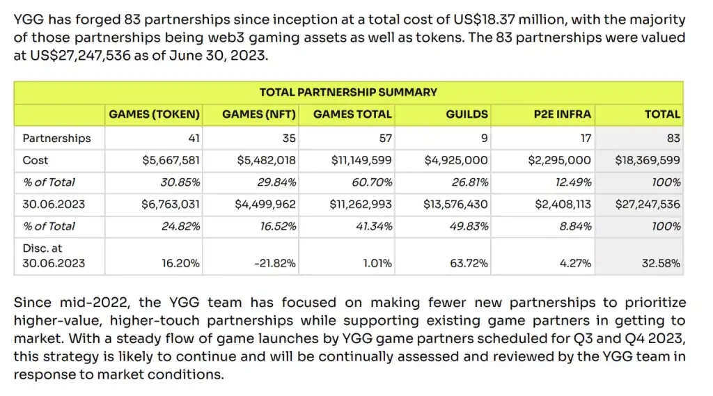 此外,YGG 在 8 月初发布的 2023 Q2 Community Update 中给出了对投资/合作项目资产的价值计算:YGG 合计持有价值 2720 万美元的游戏资产(NFT, Token,股权等),对应成本为 1830 万美元,账面浮盈 32% 。
