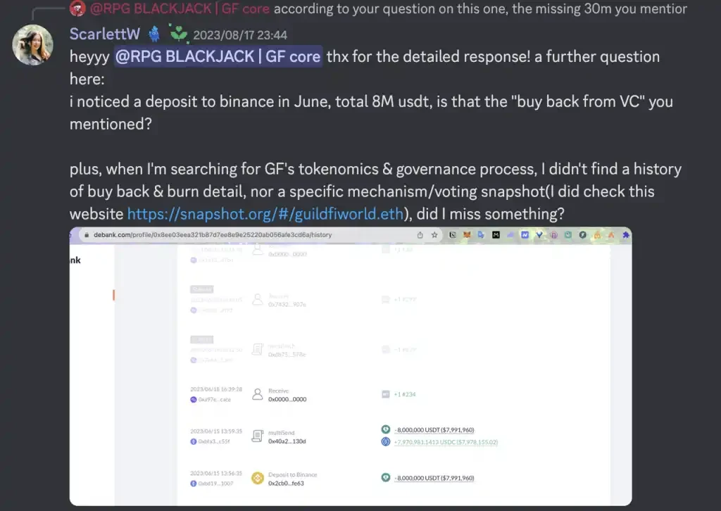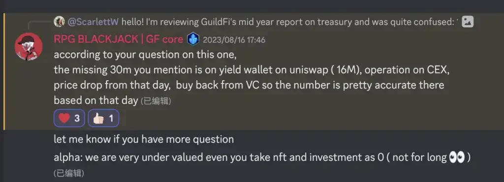 相较于 GF 发布半年度财务总结的数据,如今官方链上资产相比总结发布时的 7100 万美元缩水了 19% , 主要由代币价格下跌和将 800 万枚 USDT 转账到 Binance 导致的。官方团队表示,存放在 cex 中的资产主要用于日常运营和从投资人处回购。