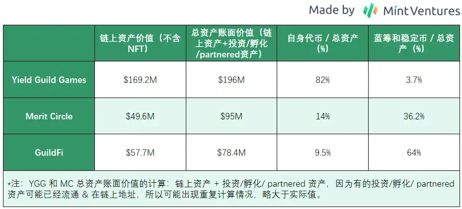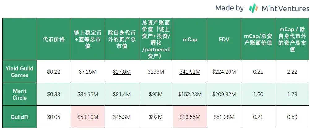 在本次 YGG 拉盘启动前,YGG 的日交易量仅每天数百万刀,流动性相当有限。而 YGG 国库中 YGG 的占比高达 82% ,意味着一旦抛售只会对价格造成毁灭性的打击,所以这里将同时对比「mCap/总资产账面价值」和「mCap/除自身代币外的资产总市值」以求客观性。综合考虑之下,价值支撑 GF > MC >= YGG(请注意,不管是「总资产账面价值」还是「除自身代币外的资产总市值」都包含「稳定币+蓝筹」和「投资/对外合作带来的 FT / NFT」,后者的计价不是市场公允价值,而是来自于融资估值,未来如果代币上市或项目发展不顺,有较大的资产减计风险。并且,对「投资/对外合作带来的 FT / NFT」,除了 Merit Circle 公示出了所有项目的成本和账面价值,其它两家并没有给出具体的算法,因此也可能有统计口径的问题。)