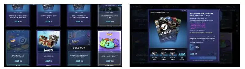 积分可以用于兑换礼品卡、游玩门票、白名单、宝箱、NFT 等。但目前,GuildFi 经验能兑换的产品相当有限,以 Steam 礼品卡为主(概率开出价值 0.5 – 30 刀的礼品卡,也可能返还 15% 的成本),Genopet、Axie 的游玩门票,Axie NFT 和 CyBall NFT(限时抽奖的形式发放)。这种抽奖盲盒兑换 Steam 礼品卡 / 游戏道具的模式,本身在传统的游戏信息聚合和休闲小游戏平台已经广泛运用。一方面跟游戏项目方合作分发游戏资产(虽然可以看到,GuildFi 的 BD 能力已经相当有限,合作的都是老项目),一方面直接将收入的一小部分兑换成玩家已有价值概念的资产,加入开盲盒模式来游戏化消除通胀。