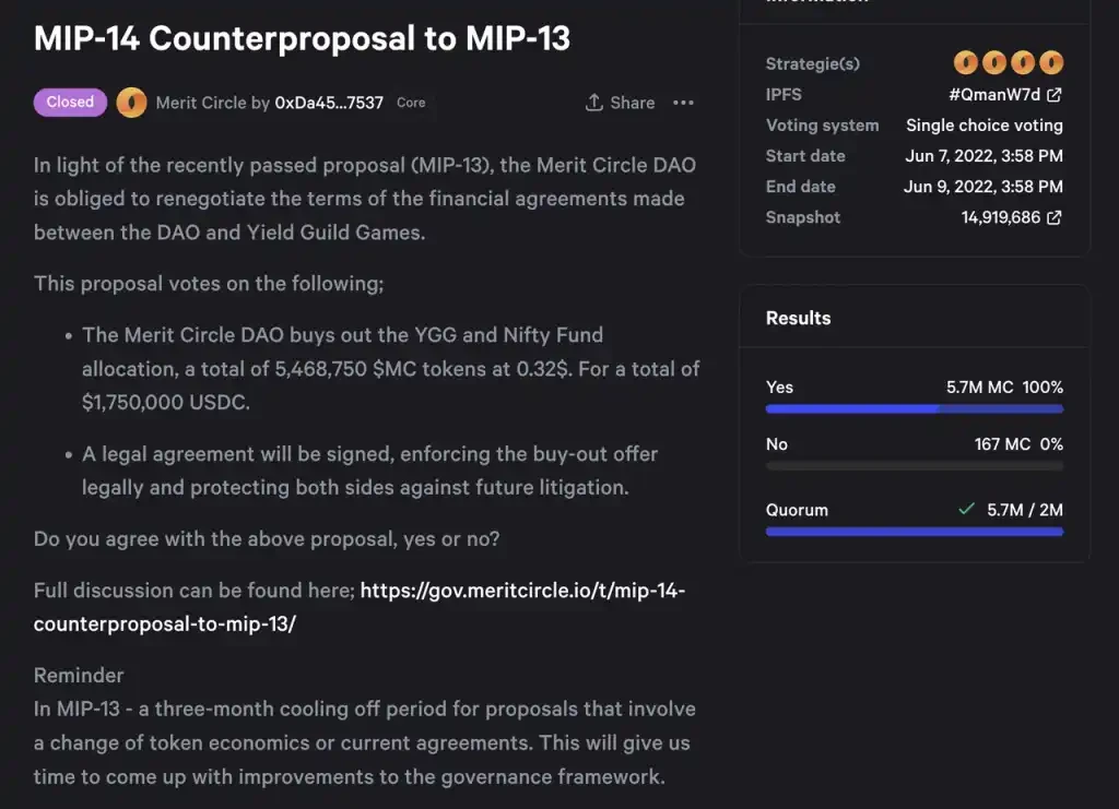 https://snapshot.org/#/meritcircle.eth/proposal/QmanW7dTyF2LvvU9iAGwj3i9D4F3TS7ZbxR33jVCmKMrgR