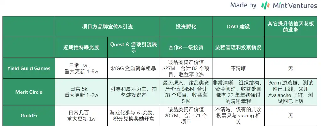 此外,从组织架构上看,YGG 的模式是 Axie 时代的产物——YGG 之下延伸出区域性的 sub DAO,方便区域性的成员触达和管理,并且缺乏与时俱进的风控体系。而 Merit Circle 则更像是一个游戏大厂,投资(且有完整风控体系)、孵化、宣传、基础设施,各个维度都做得不错。GuildFi 的投资能力和市场活跃度都逊于前两者。