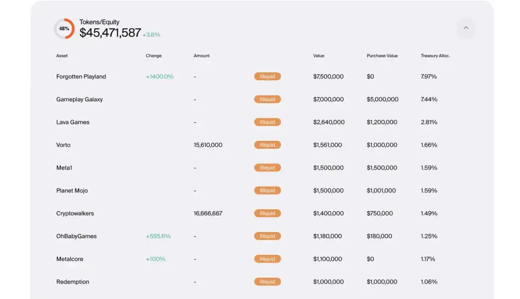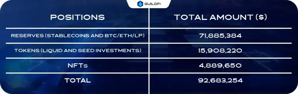 在半年度总结中,除了 Reserve 中的 7100 万美元资产(现链上共计 5770 万美元),还有价值 1590 万美元的一级市场投资和其它游戏 Token,以及价值 480 万美元 的 NFT。