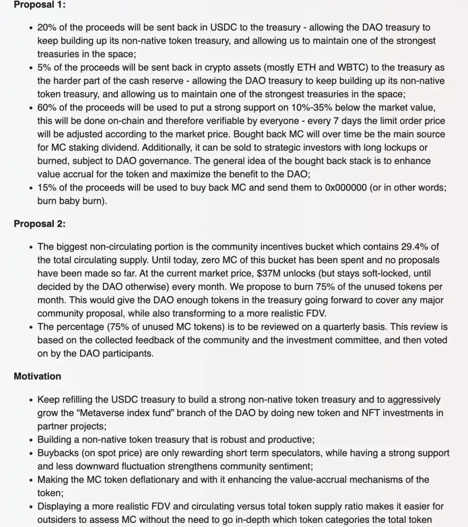 2022.01 MIP-7 ,确定收益分配和代币销毁。20% 的收益以 USDC 的形式保存在国库, 5% 的收益以 ETH/WBTC 的形式保存在国库, 60% 的收益用于适当时机低价回购以维持代币价格的稳定(低于 7 日均价 10-35% 时进行回购,这部分 MC 主要进入质押奖励,也可销售给愿意长期锁仓的战略投资人), 15% 的收益用于 MC 的直接回购销毁。另外,由于代币解锁大多释放给「社区激励」,决定每月销毁 75% 解锁的「社区激励」代币(比例可以由社区投票修改)。为 DAO 的财务库提供足够的代币,以覆盖任何主要的社区提案,也将 mCap 转变为更现实的 FDV。这里很难不惊讶于 MC 的远见,以及面对巨大诱惑的冷静——主动销毁 75% 释放给 community 的代币并不是一个容易的决定,机制的完备是 MC 国库资金平衡的基础。