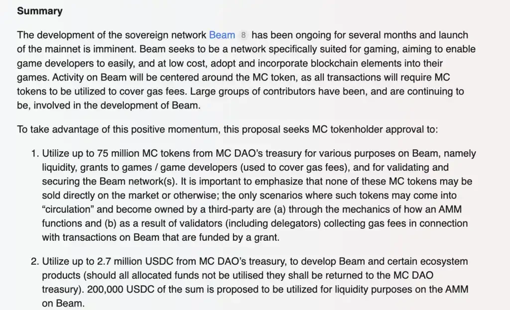 此外,MC 已经上线测试网的 Avalanche 子链 Beam 也是后续走势的一个重要事件。Beam 将采取 Proof of Stake 的模式,采用 MC 作为 gas 代币,并将采用 LayerZero 作为跨链基础设施。目前已有三款游戏在基于 Beam 进行开发。8 月 14 日,团队在社区治理板块提出草案并开放讨论: