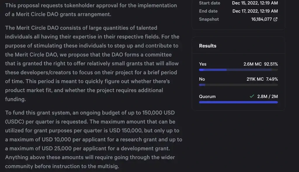 2022.12 Merit Circle Grants 的提议。每季度留出 150 k USDC 用于小额激励研究和游戏开发,Research Grant 单笔不超过 10 k, Development Grant 单笔不超过 25 k。