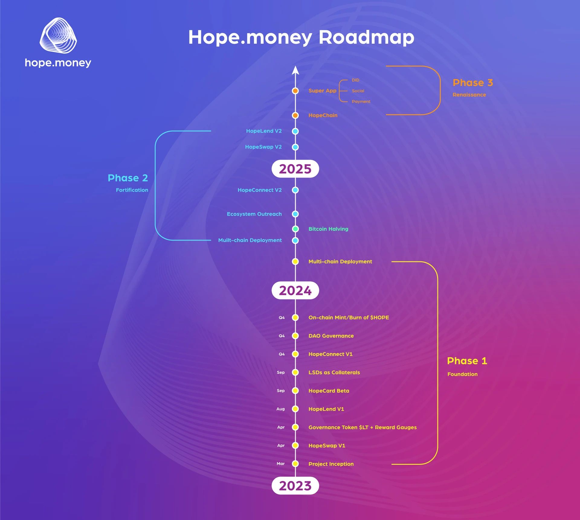 Hope.money 的最终阶段专注于在全能的 HopeChain 上开发超级应用,使$HOPE 成为连接 DeFi、CeFi 和 TradFi 的货币桥梁。