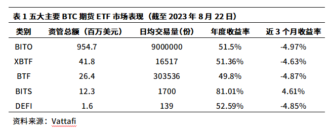 在主要的5个期货ETF中,BITO是美国首个比特币期货ETF,于2021年10月19日在纽约证券交易所上市,也是期货ETF中规模最大、影响力最强的一个。截至到8月22日数据,5大期货ETF管理资产总额约为10.37亿美元,其中,BITO管理资产总值达到9.54亿美元,占比为91.99%,日均交易量达到900万份,相比同类型高出两个数量级。但从年度收益而言,由于涵盖的ETF种类众多,BITS却是最为领先的一个,年度收益达到81.01%,即使其他ETF在近三个月内的熊市收益率均为负的背景下,其也突出重围,以4.61%的收益率独占鳌头。
