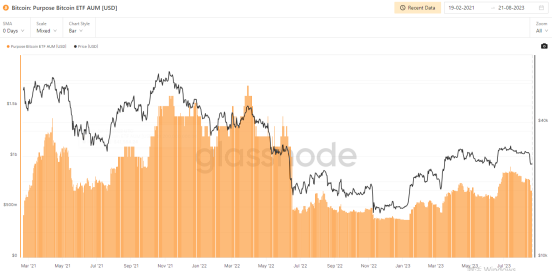 因此目前,全球较为知名的比特币现货ETF仅有2支,除了本次发行的BCOIN,还有2021年2月加拿大投资管理公司Purpose Investment推出的四类产品,根据购买货币以及风险对冲,可分为用加元购买的BTCC和BTCC.B,两者差异在于前者可对冲美元风险,后者则不能,以及用美元购买并允许投资者以美元持有比特币的BTCC.U还有碳中和理念的BTCC.J,由于这四类产品仅在多伦多证券交易所上市,且不对美国用户开放,受众相对有限。从数据而言,截至8月23日,Glassnode数据显示,该ETF管理资产总额达到65.76亿美元,持有比特币数量约2.32万枚,其中,BTCC主要为加拿大散户投资工具,现报4.96美元,汇率折算后与其最初的11加元开盘价相比,降低37.81%。