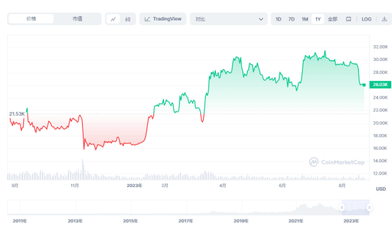 最近一年BTC价格走势,资料来源:Coinmarketcap