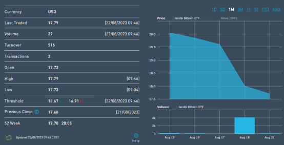 自8月18日正式上市后,截至8月22日,根据EURONEXT数据,该ETF开盘报价为17.73美元,跌破18美元的发行价格,而除了18日当天发生4122起交易后,交易量迅速下降,21日仅有50起发生,表现相当平淡,全球加密市场也风平浪静,甚至加密社区的讨论都较为稀少。