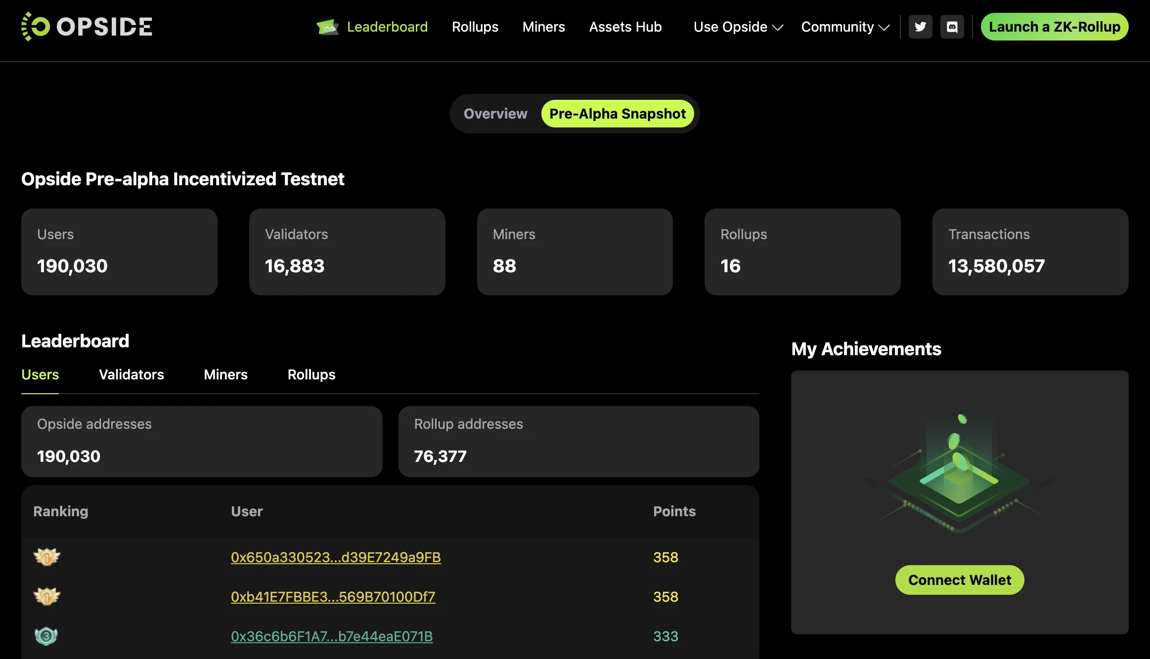 Opside 团队将在官网提供全新的 Leaderboard 看板,届时所有用户包括 validators 和矿工均可查看当前连接地址的历史积分获取情况和 Alpha 测试网排名以及额外奖励。