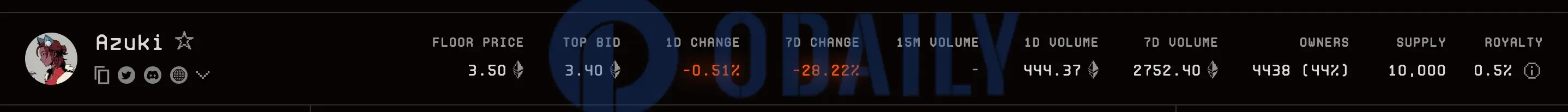 Blur 行情显示,Azuki 地板价跌破 4 ETH,现地板价为 3.50 ETH,七日跌幅 28.22% 。