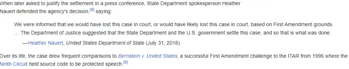 另一个值得注意的类似案例是 Cody Wilson(美加密无政府主义者)与美国务院就 3D 打印枪支代码的合法性展开的,他们试图根据 ITAR(国际武器贸易条例)规定起诉该代码。