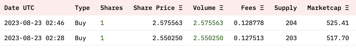 在 CEX 等传统交易场所中,通过订单薄来撮合成交是最核心的定价机制。买家和卖家不断发起出价,双方达成一致则成交。而这个成交价格,被交易平台即时显示出来,也是我们所观察到的平衡了交易双方预期的瞬时价格。但在 friend.tech 中,这个不断成交的过程并不存在。