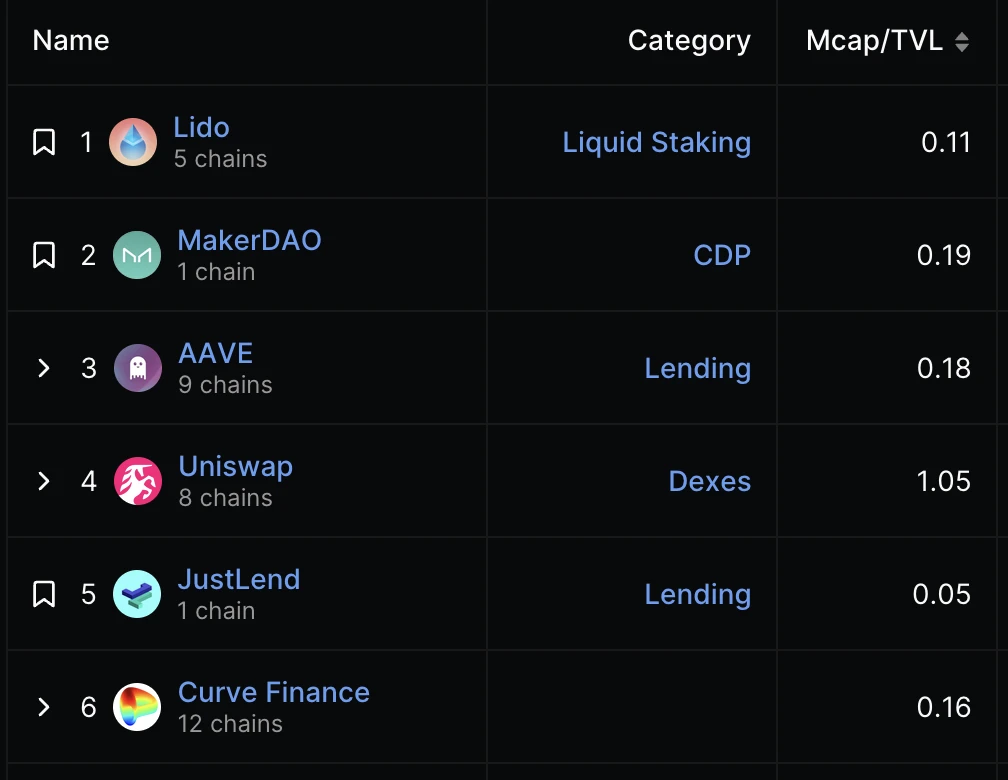 DeFiLlama 数据显示,这一数据远高于其他链上协议。这在一定程度上代表其当前市值是虚高的。