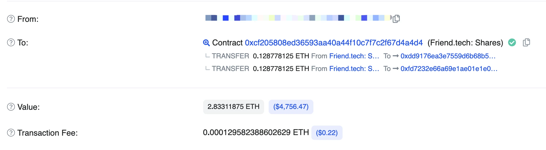 上图是 friend.tech 中一笔典型的买入交易。我们可以看到,用来购买份额的 2.83 ETH 在扣除两笔 5% 的分成后,全部打入到了一个尾数为“ a4d4 ”的合约地址。(顺带一提:无需借助 NFT 作为中介、直接“以钱换钱”也是该项目的一大重要创新。此外,取消了 mint 还更节省 gas。)