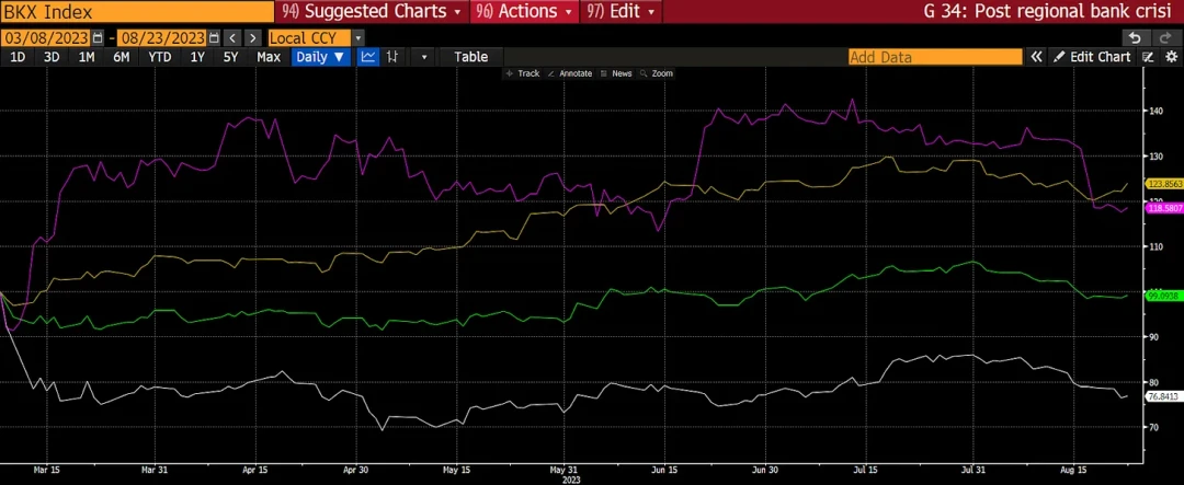 以 2023 年 3 月 8 日为基准(Silvergate 银行申请破产的那一天),我观察了美国地区银行指数(白色)、罗素 2000 指数(绿色)、纳斯达克 100 指数(黄色)以及比特币(洋红色)的表现。