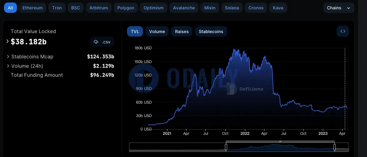 DefiLlama 数据显示,全网 DeFi TVL 目前约为 381.8 亿美元,已逼近 2021 年 2 月以来低点,即 2023 年 1 月 1 日的 379.11 亿美元。