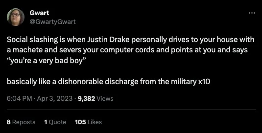 Gwart 曾发推表示“社会惩罚就是 Justin Drake 拿着大刀开车来到你家门口,剪断你的电脑网线,指着你说“你是个坏蛋。’”