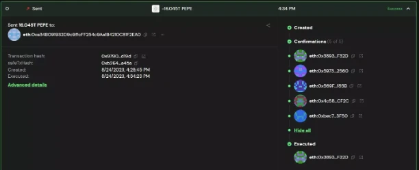 公告称,自成立以来,PEPE 一直饱受内部纷争的困扰,团队中的一部分人因自负和贪婪而成为不良行为者。此前由于无法签署交易、存在意见分歧以及连续数周无法与其取得联系,这些人阻碍了团队使用多签钱包进行捐赠或购买代币的进度——多重签名设置为需要 3/4 签名者出席才能获得批准。3 名前团队成员于 8 月 25 日秘密回归,修改了多签阈值,窃取多签钱包中 60% 的代币,也就是那 16 万亿枚 PEPE,并将其发送到交易平台出售。